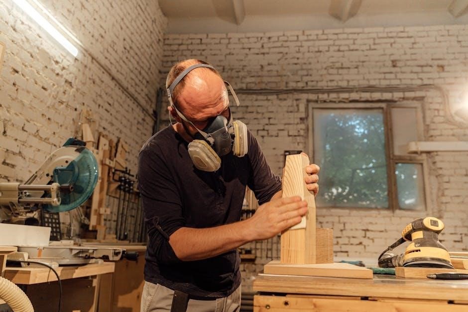 When operating the Craftsman Manual Miter Saw, wearing proper PPE is essential for safety. Safety glasses or goggles protect eyes from flying debris, while ear protection minimizes exposure to loud noises. A dust mask prevents inhalation of sawdust, and gloves provide grip and splinter protection. Steel-toe boots or sturdy footwear safeguard feet from heavy objects. Ensure all PPE fits properly and remains worn throughout the cutting process to minimize risks and maintain a safe working environment.