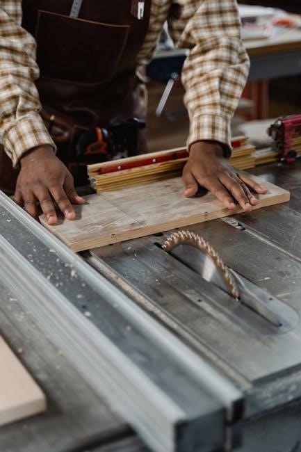 Adjusting the Craftsman Manual Miter Saw for various materials ensures optimal performance. For wood, use a sharp crosscut blade and set the miter angle accordingly. For metal, switch to a carbide-tipped blade and reduce cutting speed. When cutting plastic, apply light pressure and use a blade with a lower tooth count to prevent melting. Always consult the manual for material-specific blade recommendations and adjust the fence alignment for precise cuts. Proper adjustments enhance accuracy and extend the tool’s lifespan. Regularly check blade condition and alignment to maintain consistent results across different materials. Safety and precision are paramount in every adjustment.